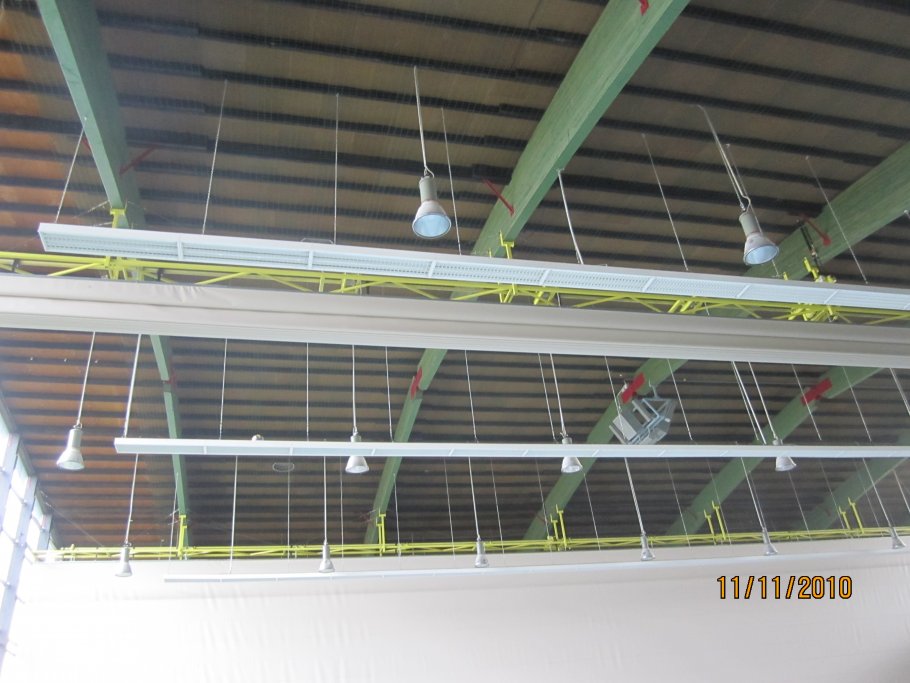 - Hauptkonstruktion: Ein weitgespanntes hölzernes Dreigelenk-Bogen-Tragwerk mit 7 Hauptachsen