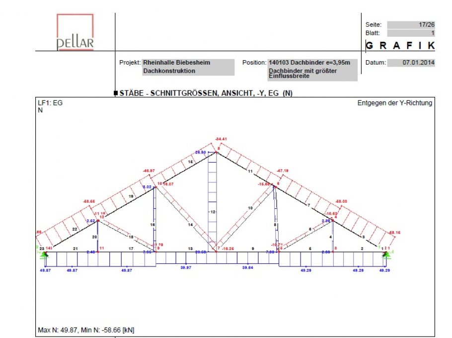 - Haupttragwerk:12 hölzernen Fachwerkträgern im Abstand von ca. 3,56m mit einer Stützweite von 14,82 m